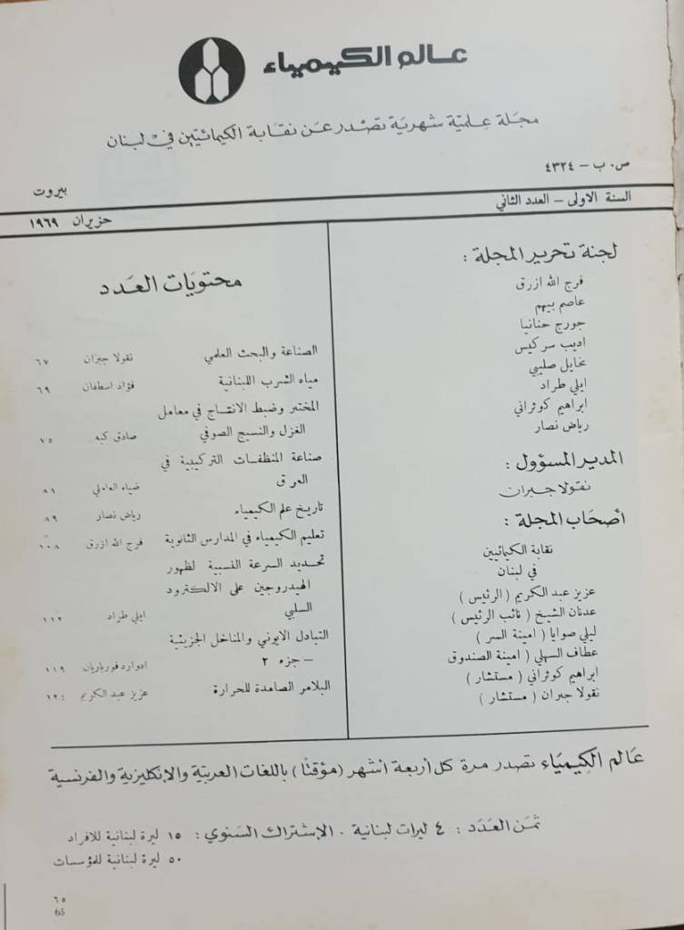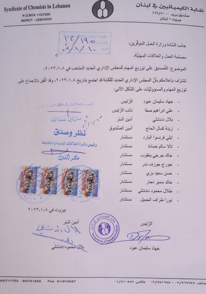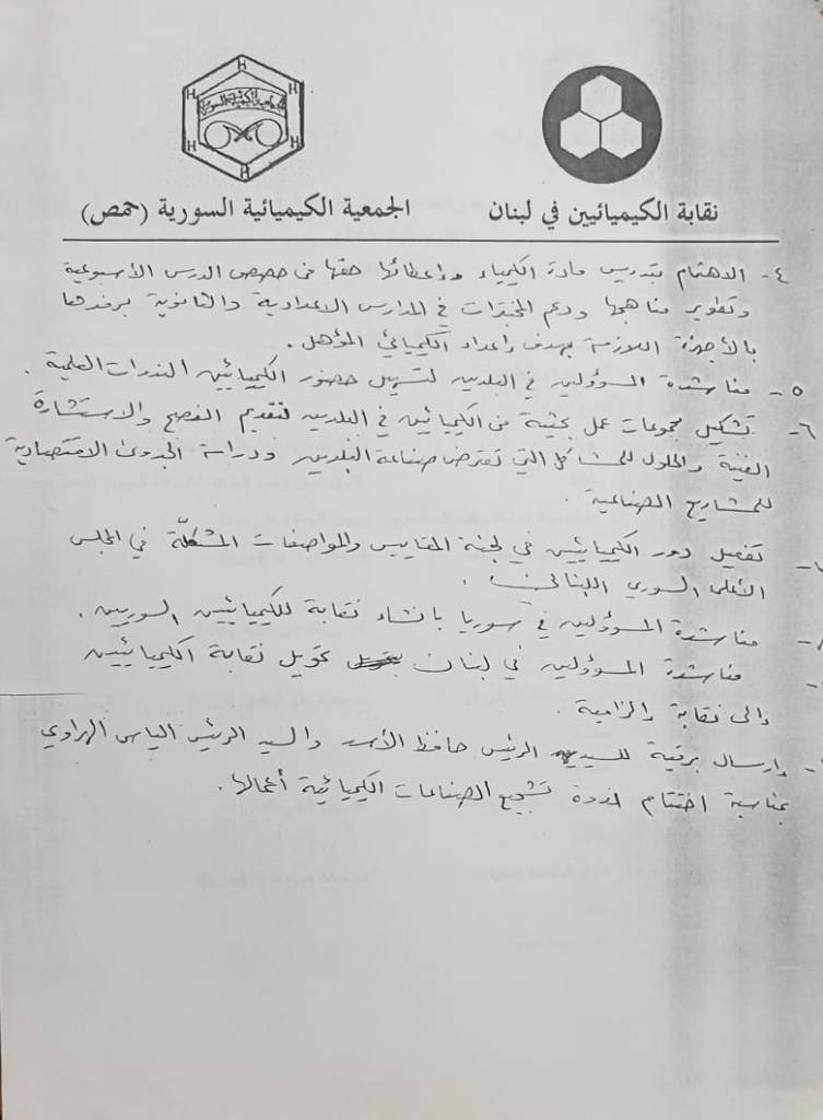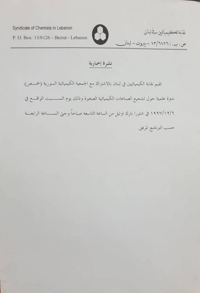 The Syndicate of Chemists was established in 1962, and the legislative body approved the union’s mandatory file in 1992. The syndicate was interested in the chemical and petrochemical industries and in industrial planning, and had an active participation with the Libnor Foundation in discussing Lebanese specifications and standards, and contributed with the Ministry of Agriculture by researching the Food Codex in 1973, and the syndicate participated in the Cairo Conference of Chemists. In 1972 to establish the Union of Arab Chemists. Since its history, the Syndicate of Chemists in Lebanon has become an “active” member of this union.