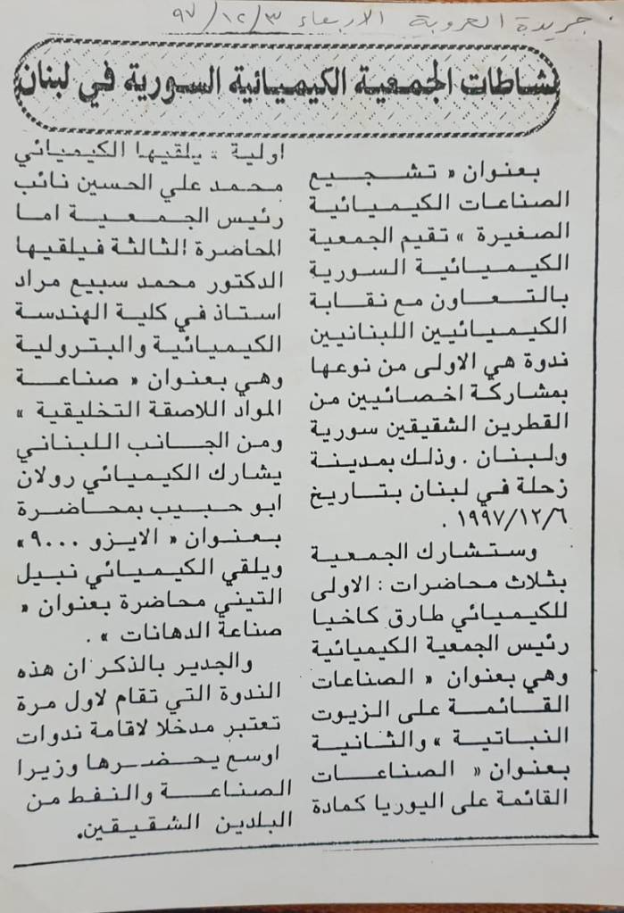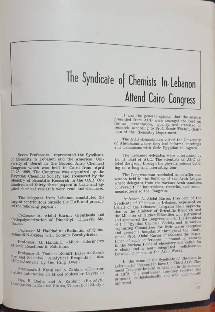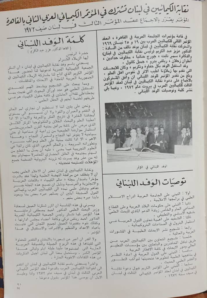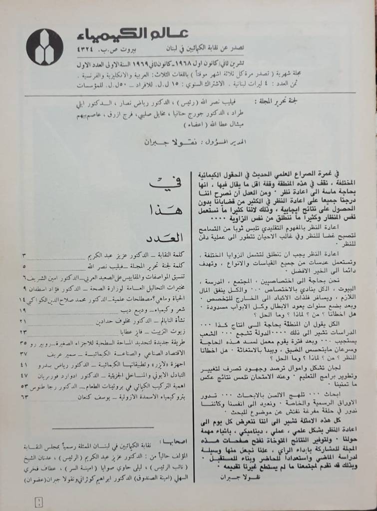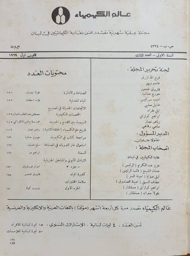 The Syndicate of Chemists was established in 1962, and the legislative body approved the union’s mandatory file in 1992. The syndicate was interested in the chemical and petrochemical industries and in industrial planning, and had an active participation with the Libnor Foundation in discussing Lebanese specifications and standards, and contributed with the Ministry of Agriculture by researching the Food Codex in 1973, and the syndicate participated in the Cairo Conference of Chemists. In 1972 to establish the Union of Arab Chemists. Since its history, the Syndicate of Chemists in Lebanon has become an “active” member of this union.