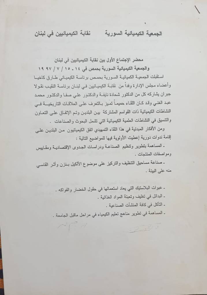 The 22nd session of the Supreme Council of the Union of Arab Chemists was held in Beirut in 2002, and the Chemical Safety Charter was issued in 2003. It contributed, along with the Educational Center for Research and Development, to developing chemistry education programs in 1999. The union submitted a report on “Possibilities of Oil and Gas Extraction” in 2000, and it was delivered to the President of the Republic, Emile Lahoud, the Speaker of the Parliament, Nabih Berri, the Prime Minister, Salim Al-Hoss, and also to the martyr Prime Minister. Rafik Hariri, the Council of Ministers approved the mandatory union file and it was referred to the House of Representatives in 2021. The union signed a memorandum of understanding with the Ministry of Industry in 2021. One of the most important current topics that the union is concerned about is the treatment of solid waste in Lebanon and its risks to the environment and humans, and the union had an active role.” In shedding light on the solid waste management strategy.